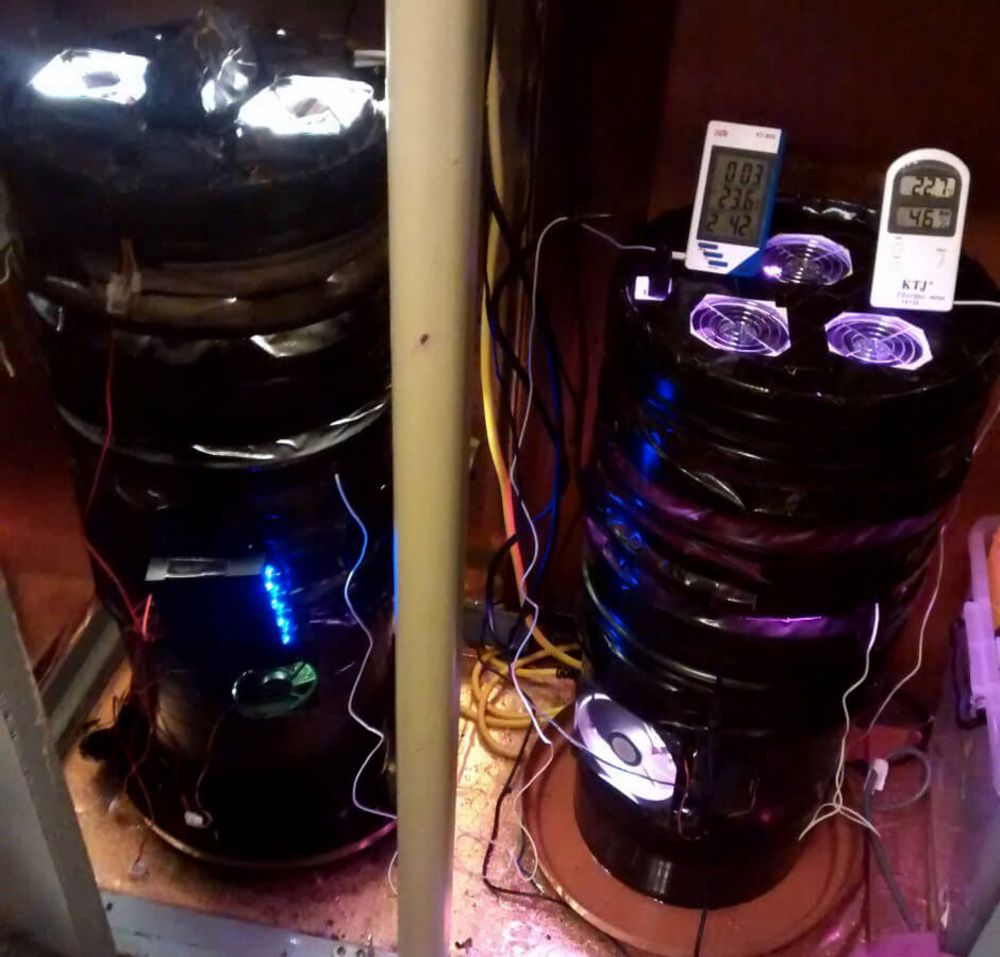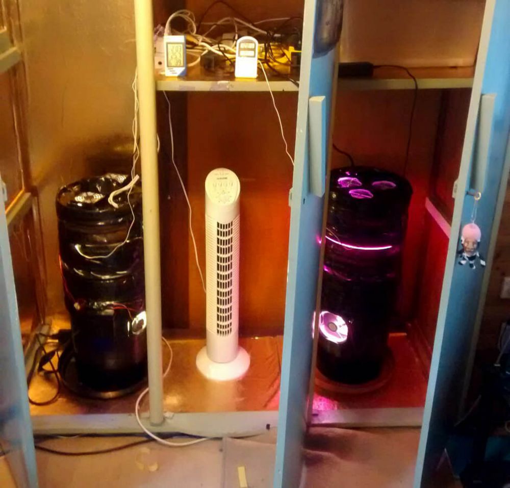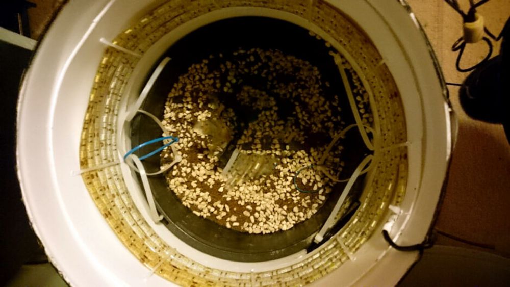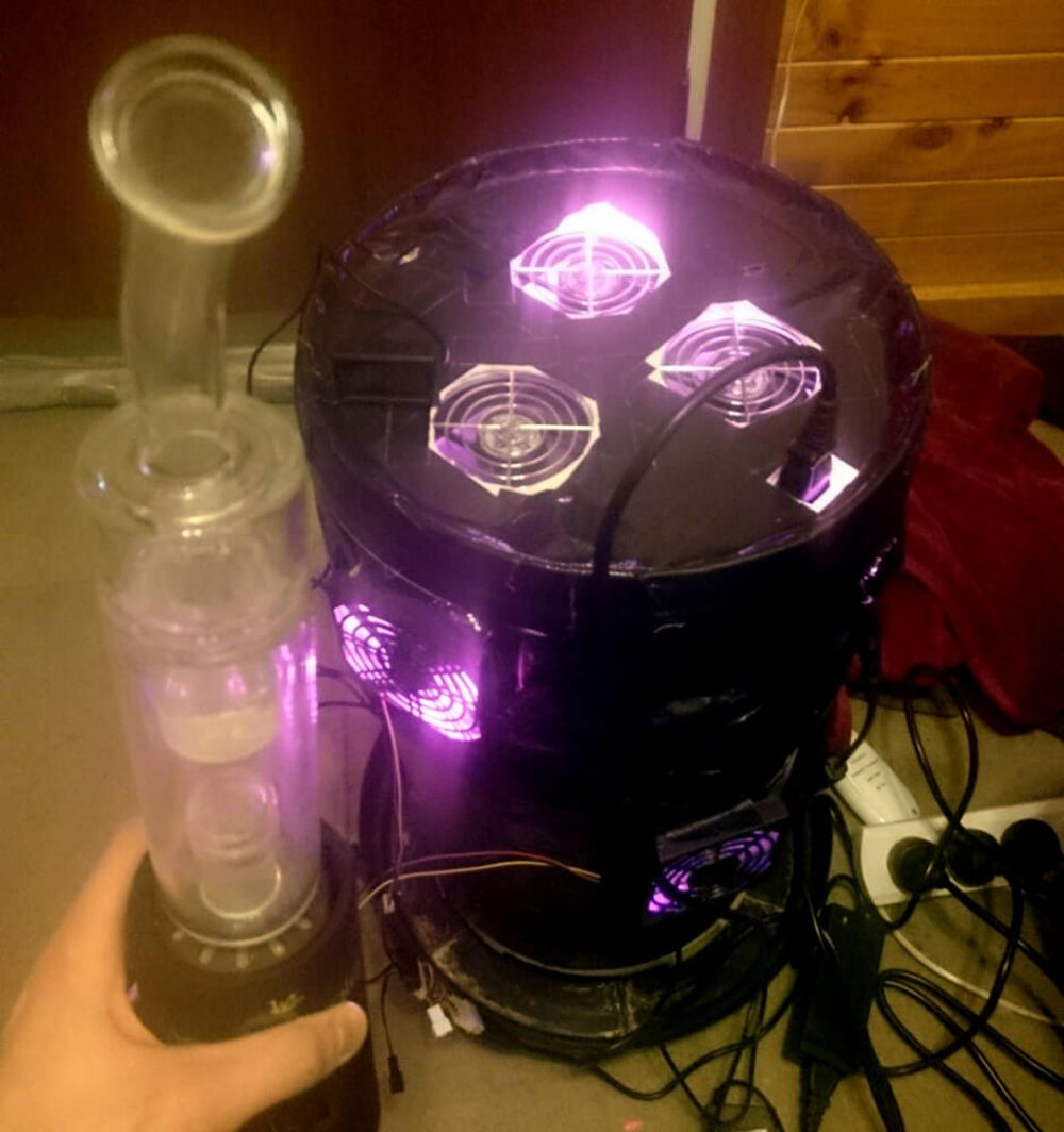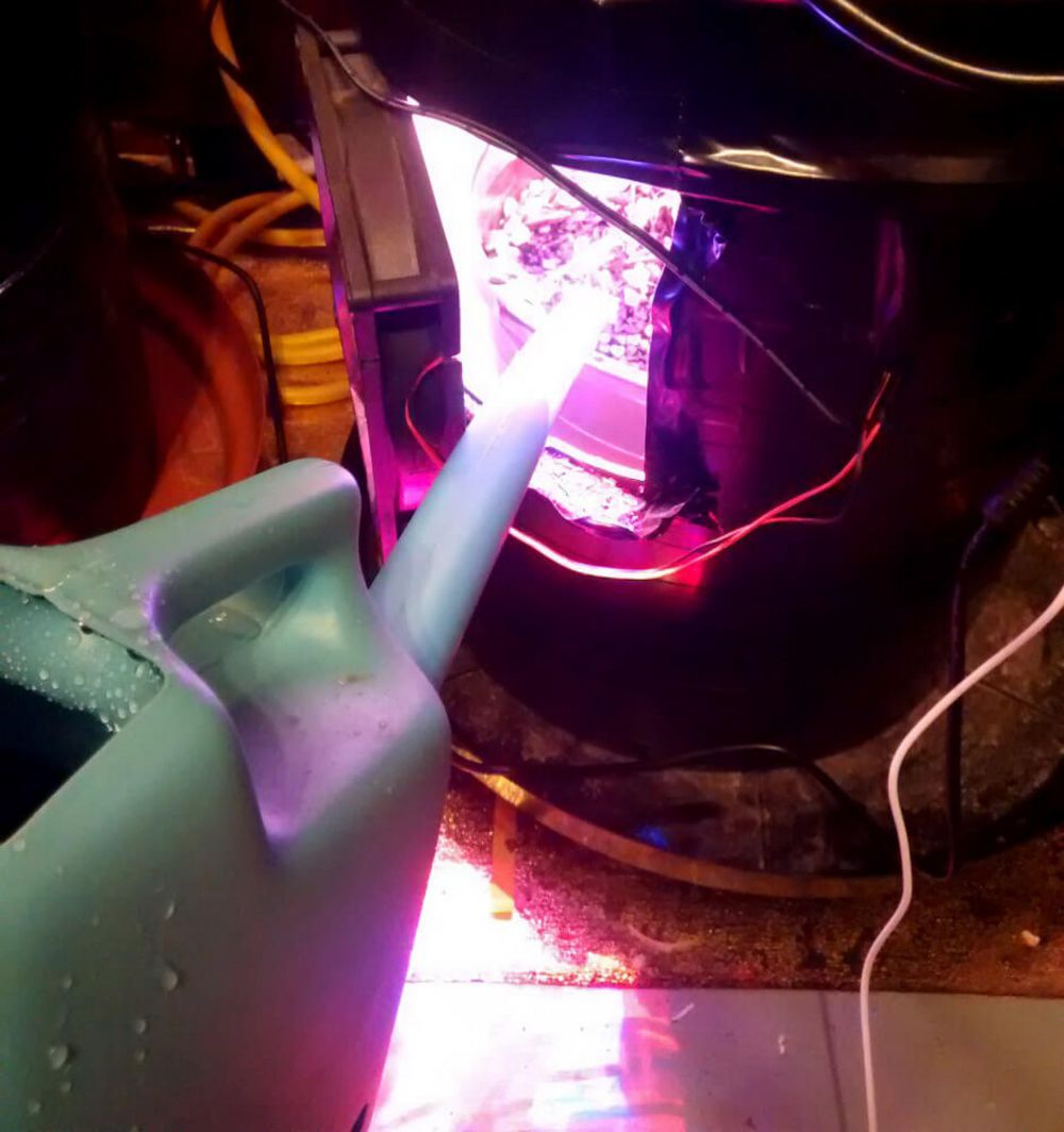 Got a UFO LED light powered at ~135w. I swapped the fans around so the UFO would become the exhaust for my bucket. Be careful, no idea if this is safe! Testing it right now. Also salvaged a fan from an old PC and spliced the wires with a 12v 1A power supply. Drilled holes in the bottom of the bucket for drainage. Covered it all in tape which was really satisfying.