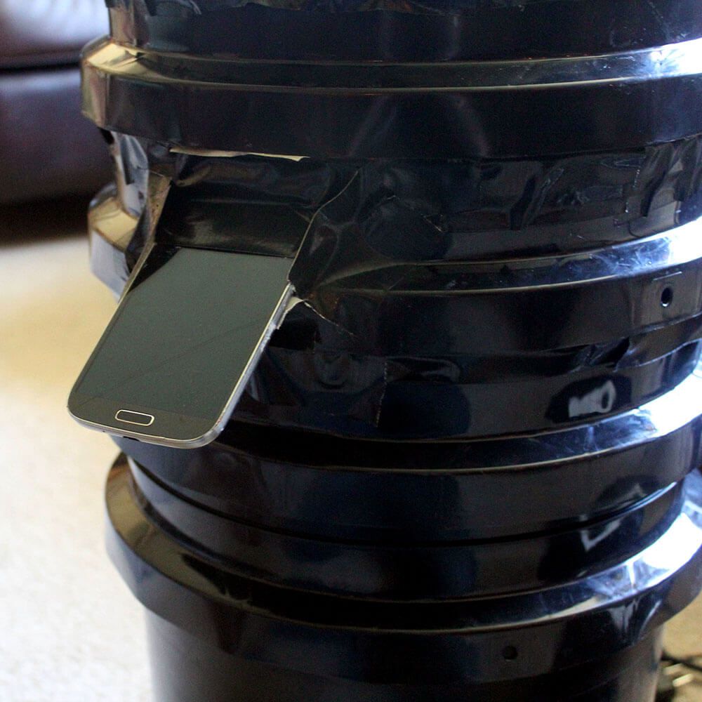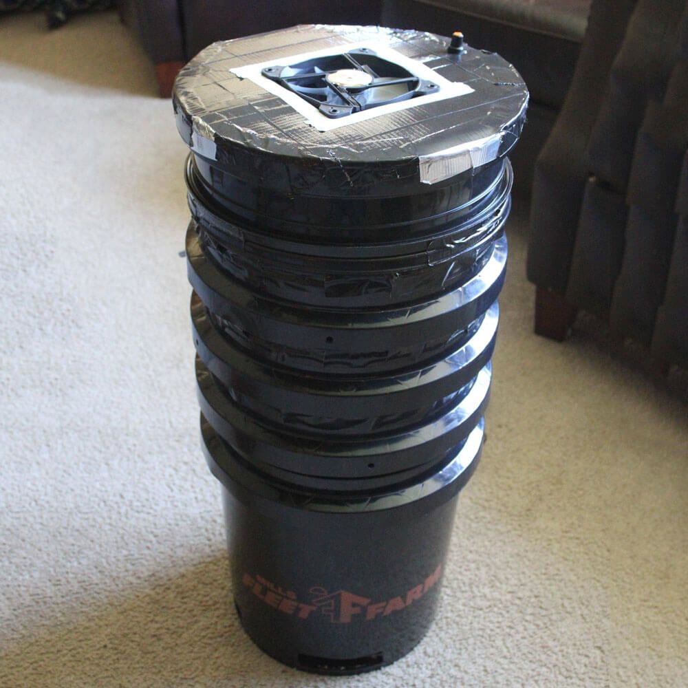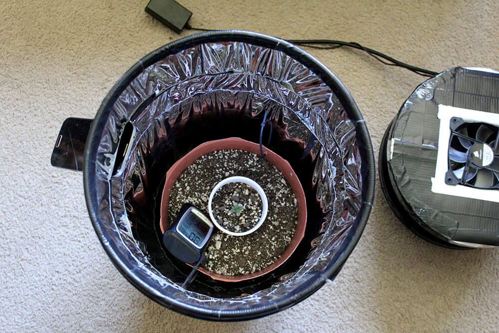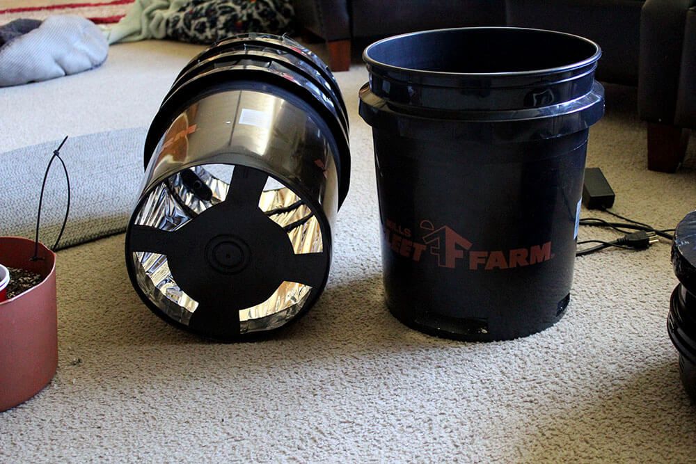 This is my Space Bucket build! It took a few prototypes to get to this point, hope you like it. I cant wait to see what kind of plants it can produce! I have a top mounted exhaust fan with controls for my main lighting, a 180w UFO LED light. Switched the fan with a Noctua I had around. Also flipped the fan so it would be exhausting from the UFO. Mylar is held in place by duct tape inside the bucket, glue turned it transparent over time. I use this IP webcam app with a Samsung Galaxy S4 so I can check in on temps without having to open the bucket, you can also set up port forwarding so you can check it without being connected to your network.